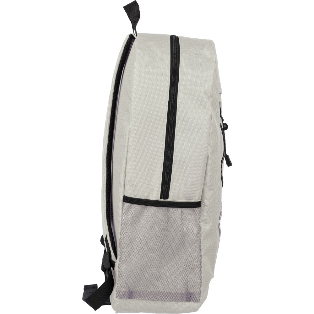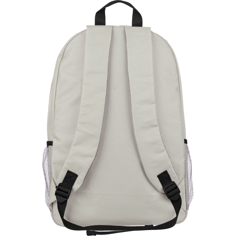 RPET poliészter 600D anyagból készült hátizsák húzózsinóros záródással és nagy cipzáras fő rekesszel. Hálós oldalzsebekkel, rugalmas elülső pántokkal, dekorációhoz kialakított kis elülső cipzáras zsebbel és állítható vállpántokkal rendelkezik. A terméken rPET alapanyagra utaló címke található.