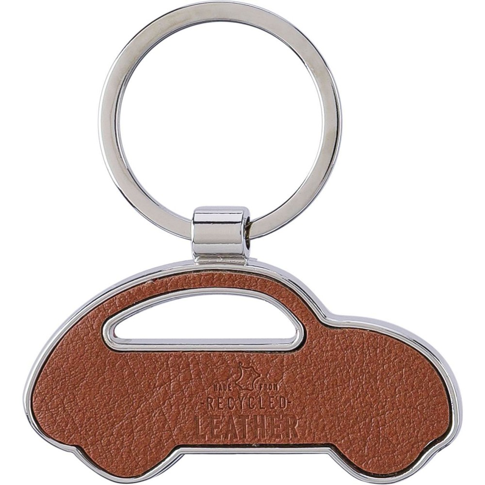 Kulcstartó autó alakú, újrahasznosított bőrből, fém karikával. Oldalán dombornyomott újrahasznosított bőr anyagra utaló logóval. Egyenként barna kartonhüvelybe csomagolva. Anyaga: újrahasznosított bőr.