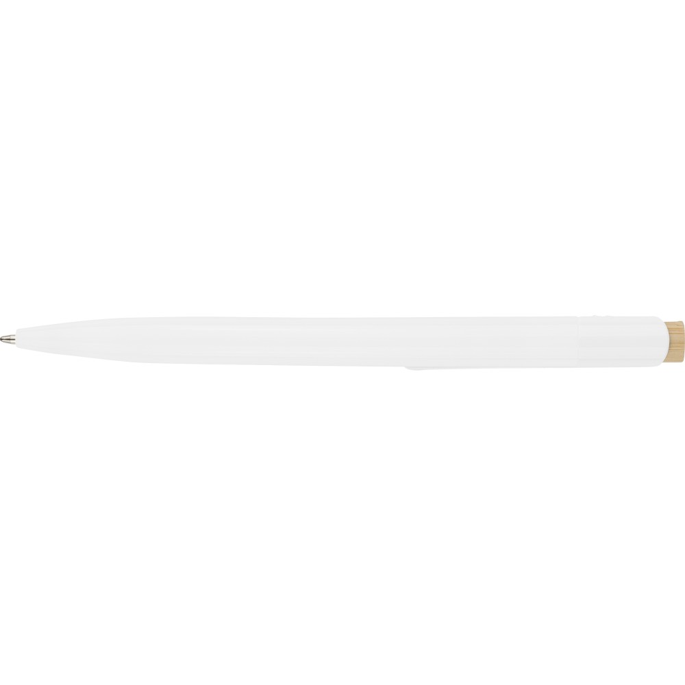 Újrahasznosított ABS-ből készült golyóstoll bambusz nyomógombbal és fehér klippel, digitális nyomtatásra alkalmas kivitelben. A tolltesten fröccsöntés során elhelyezett recycled (újrahasznosított) alapanyagra utaló logó található. Megközelítőleg 600 méter íráshosszúságú, kék színű tollbetéttel.