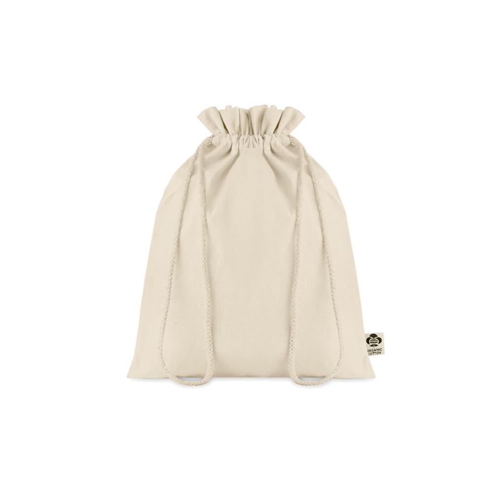 Közepes méretű húzózsinóros ajándéktasak biopamutból. Méret kb. 25x32 cm. 105 g vastag anyag.