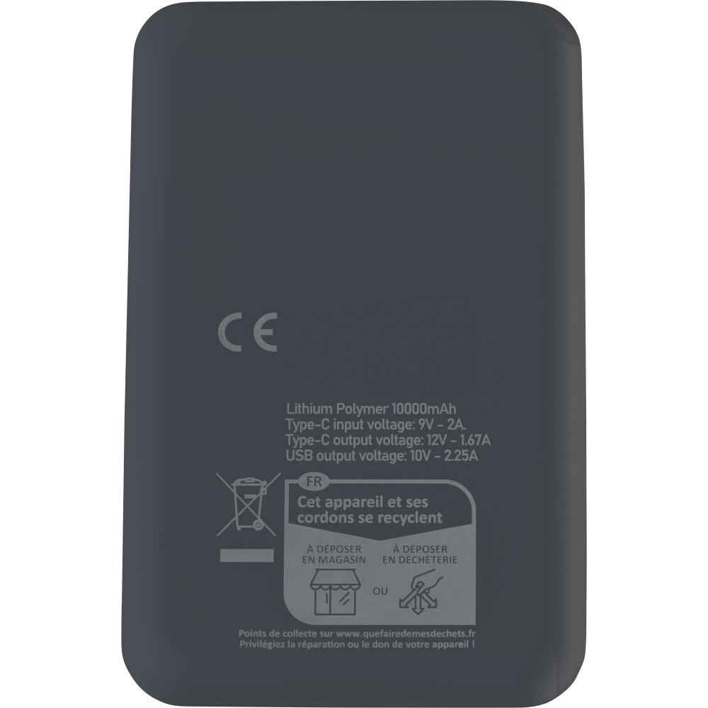 Újrahasznosított ABS anyagból készült powerbank 10 000 mAh kapacitással és 22,5 W gyors töltési teljesítménnyel. Type-C in/out és Type-A bemenettel, digitális kijelzővel, sima és texturált felülettel. Biztonsági védelmekkel ellátva. A hátoldalon gravírozott recycled (újrahasznosított) alapanyagra utaló logó található. Selyempapírral bélelt barna dobozba csomagolva.